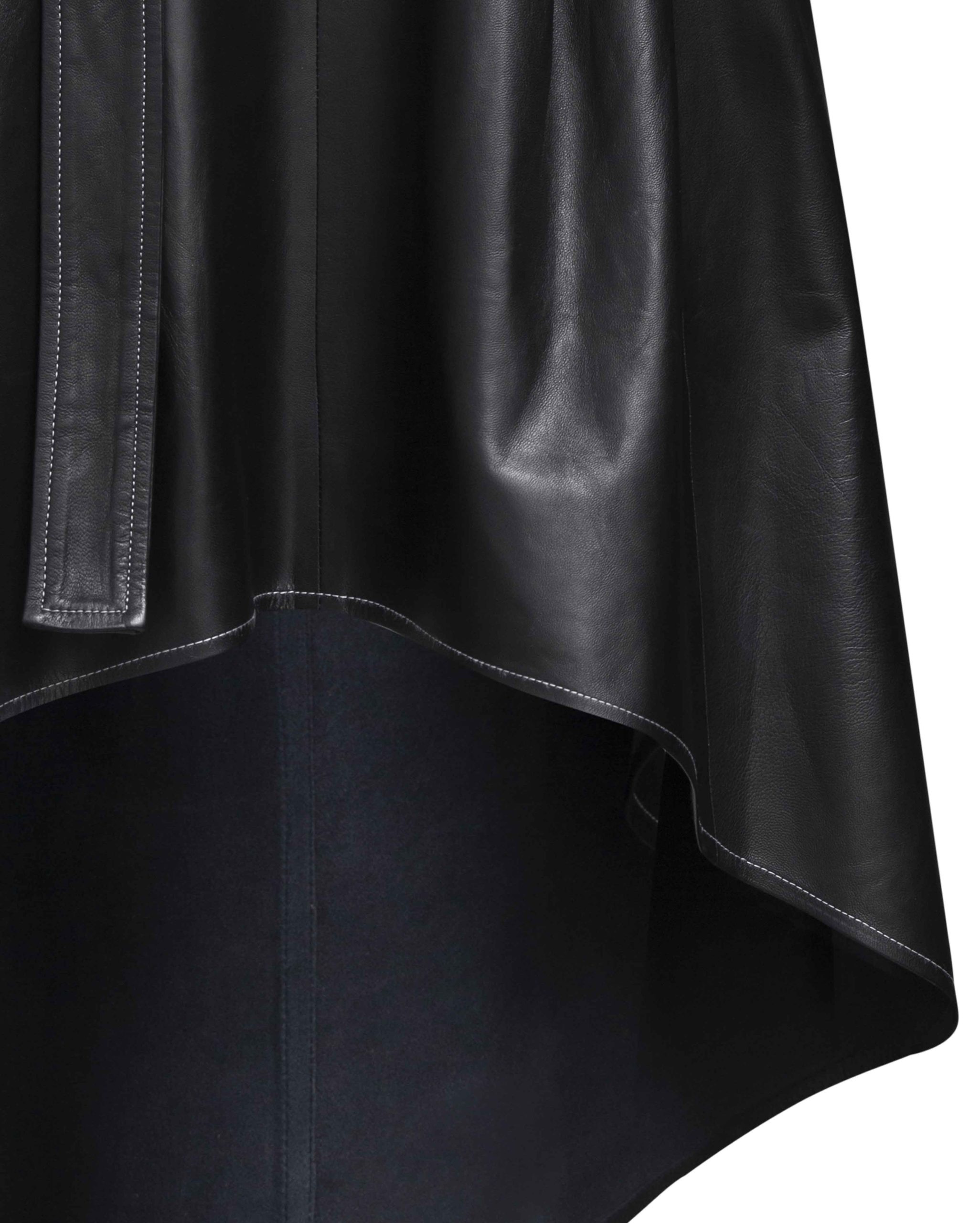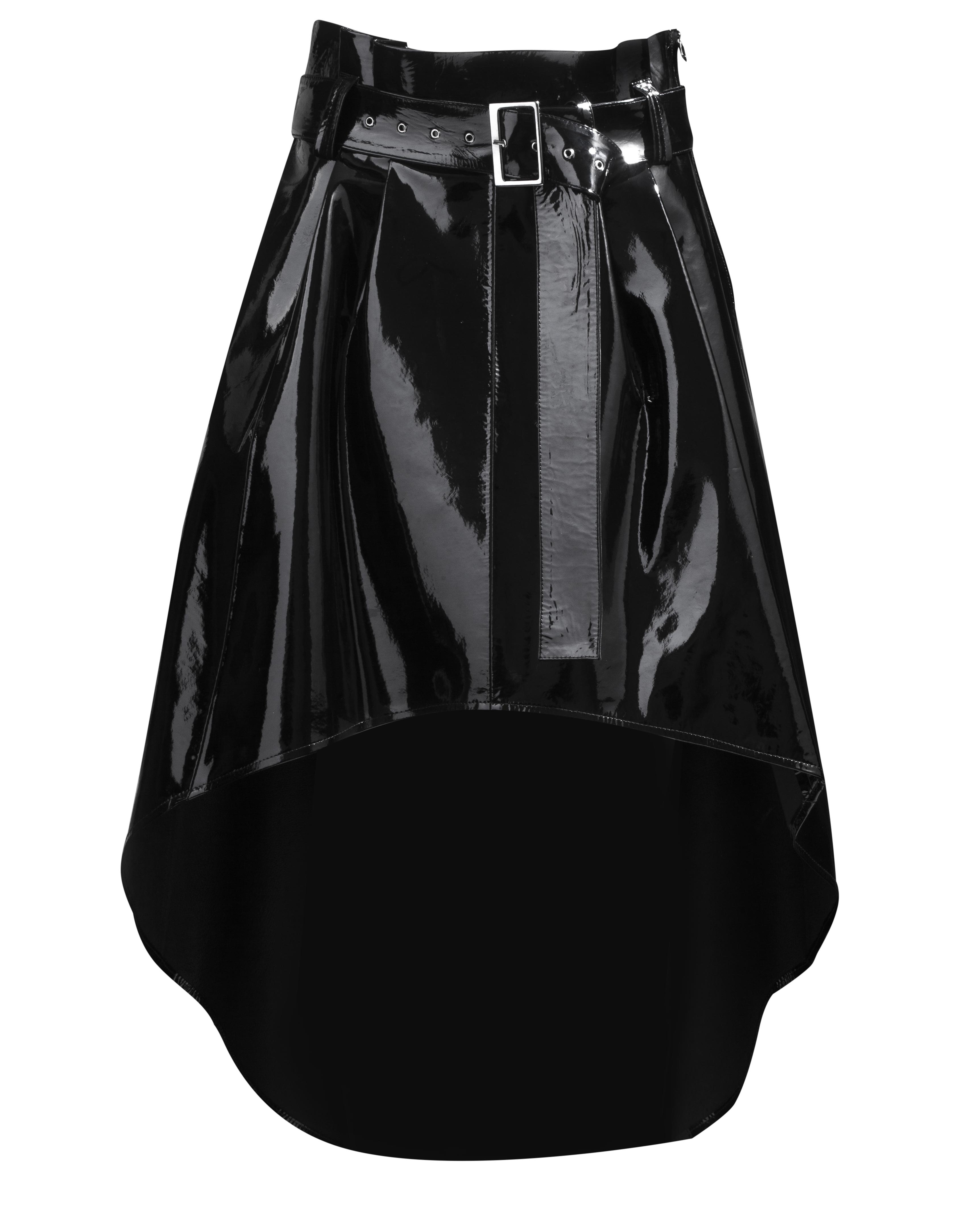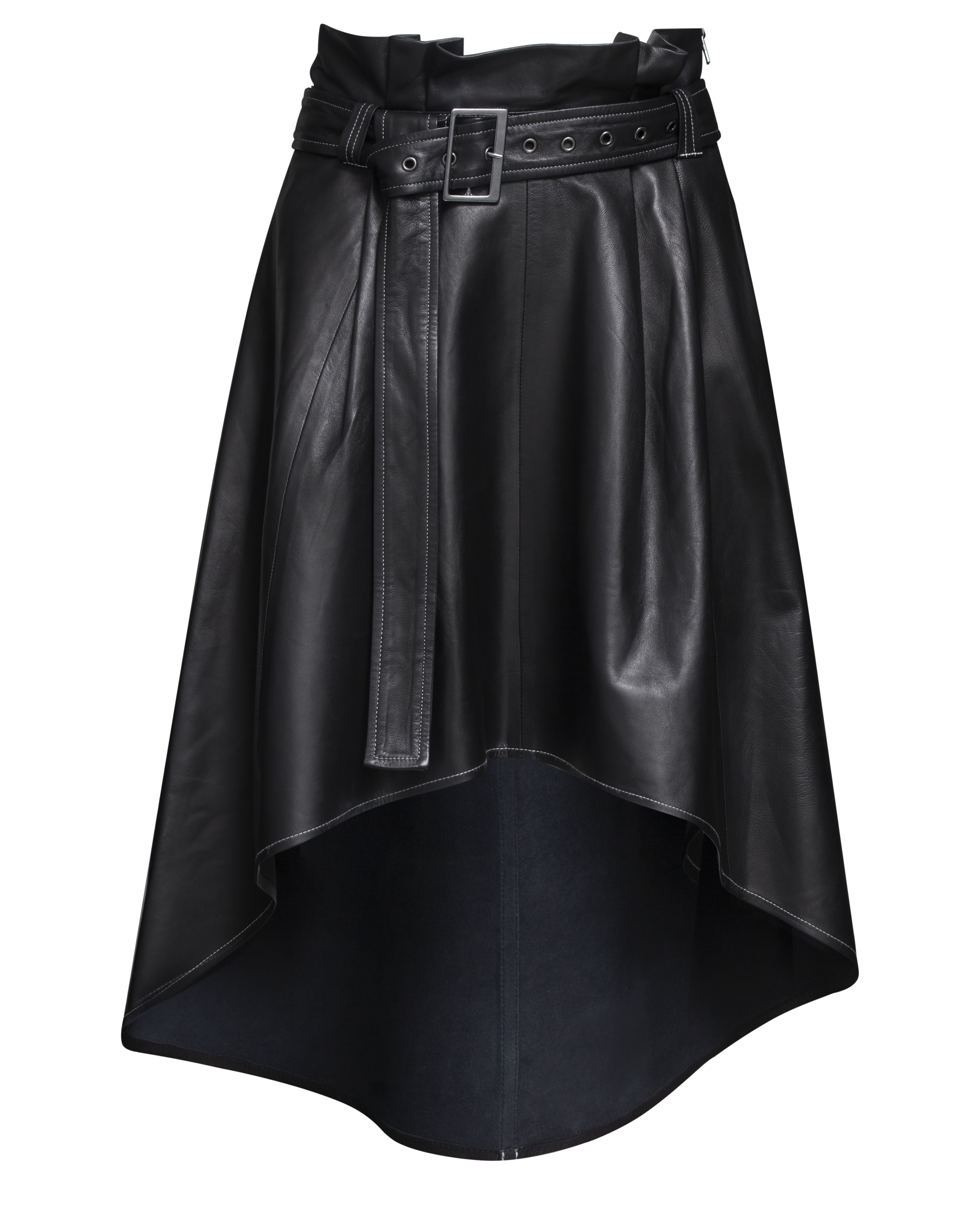 Esta es una falda de corte desigual que se ajusta con un cinturón de doble función, sirve para ajustarla y como un accesorio adicional.